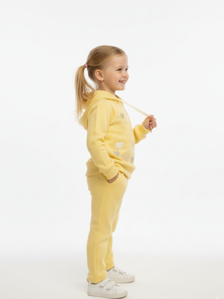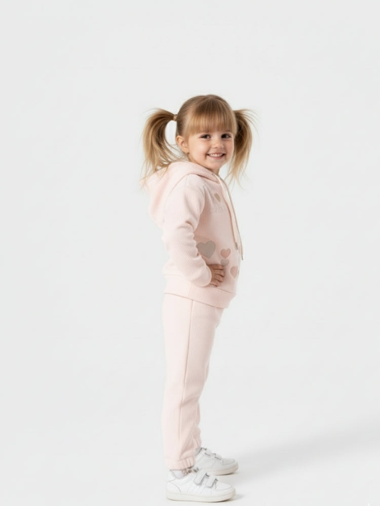 السويتشيرت والبنطلون من نفس الخامة، مصنوعة من قطن قطيفة ناعم مبطّن بخامة خفيفة تحافظ على الدفا من غير ما تبقى تقيلة، وعليها طبعات قلوب بتضيف لمسة أنوثة رقيقة وذوق راقي