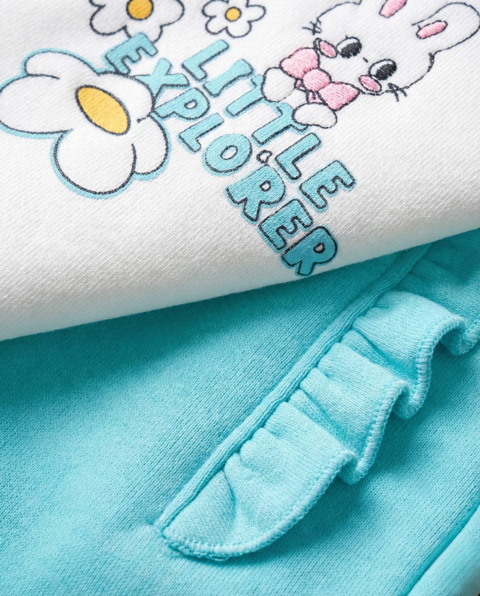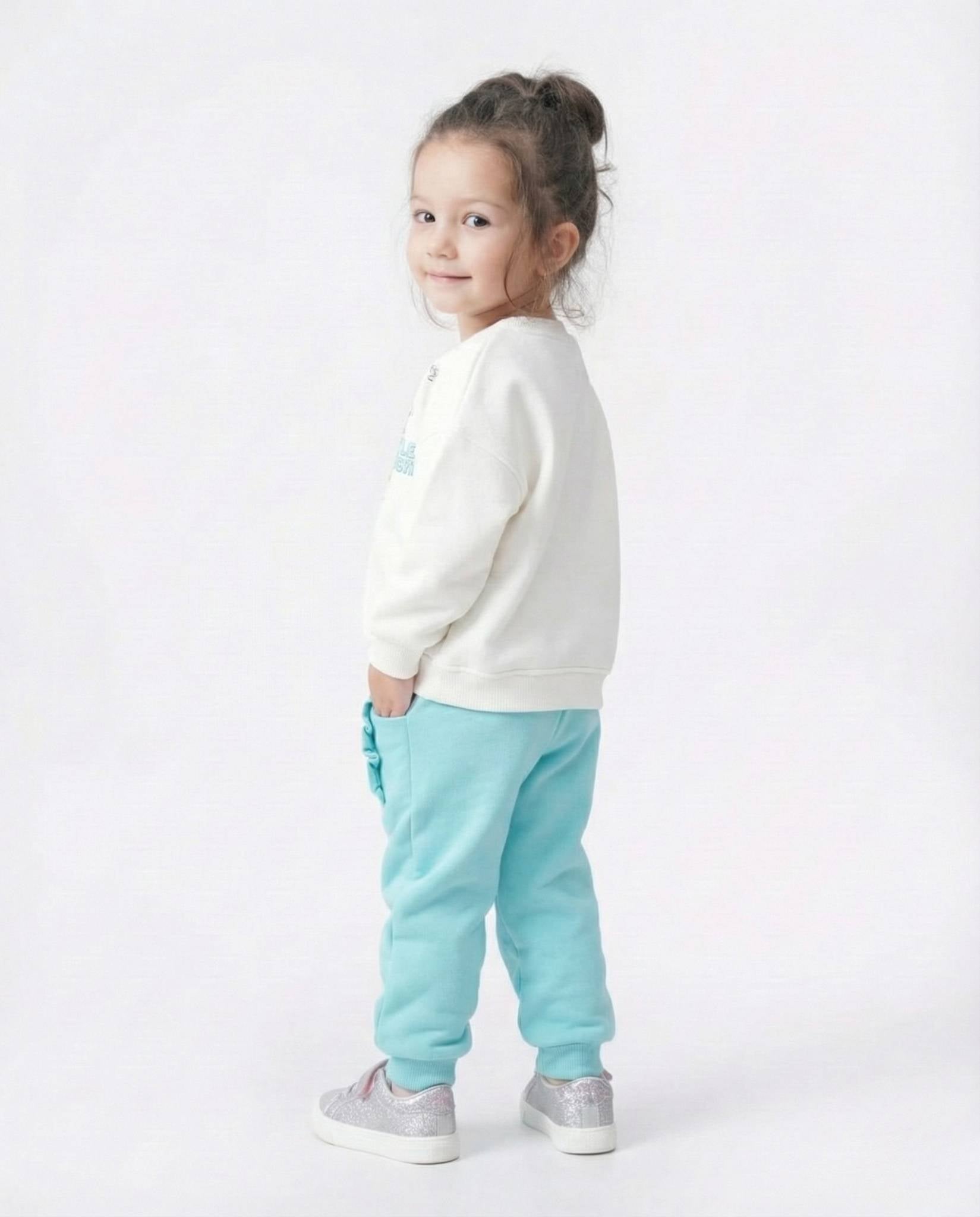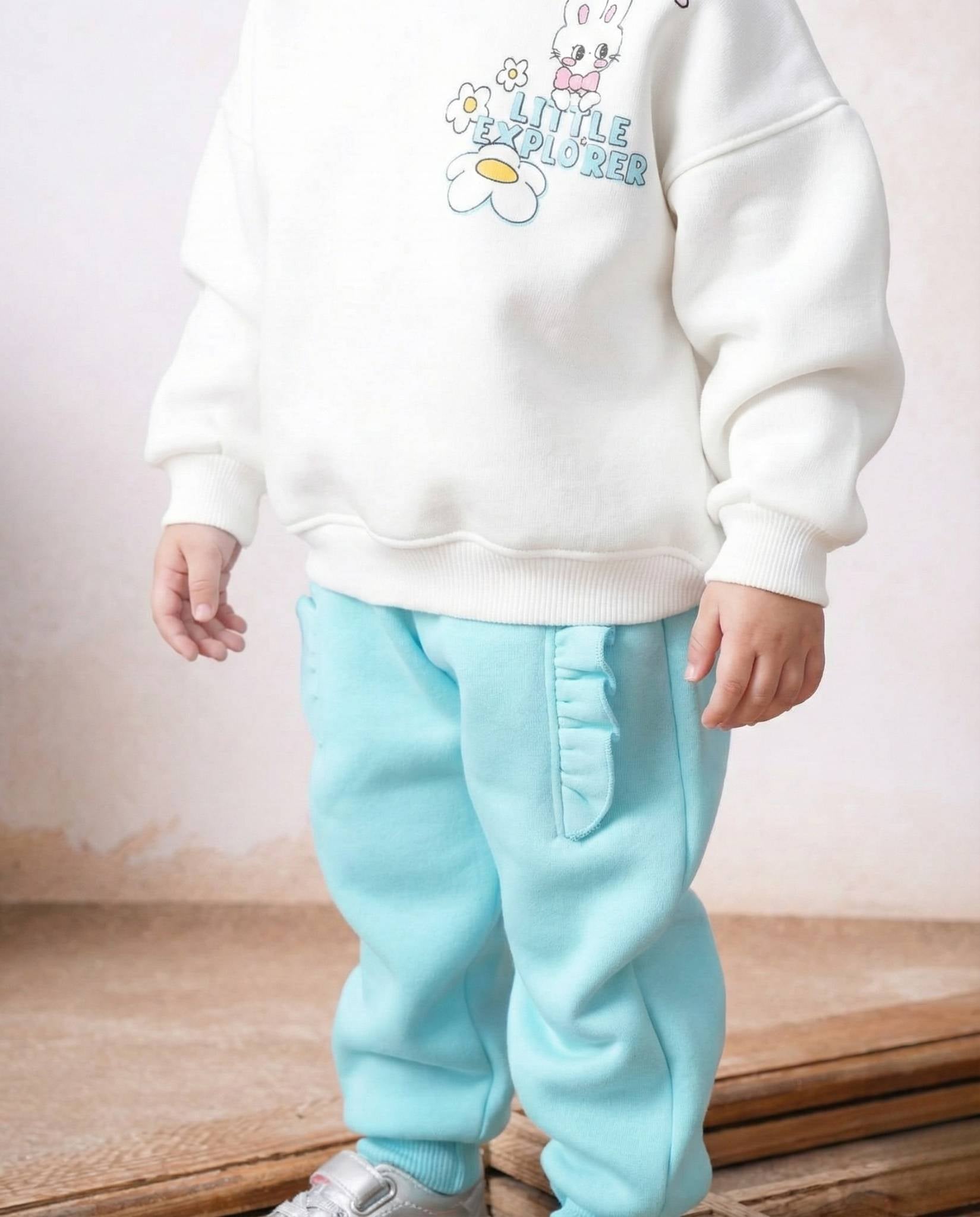 طقم شتوي للبنات ناعم ومريح، مصنوع من قماش قطني لطيف على بشرة الطفل وبيوفر راحة طوال اليوم. الطقم مكوّن من قطعتين (سويتشيرت وبنطلون) بتصميم عملي وشكل أنيق، ومزين برسومات لطيفة، مناسب للاستخدام اليومي والخروجات في الطقس البارد.