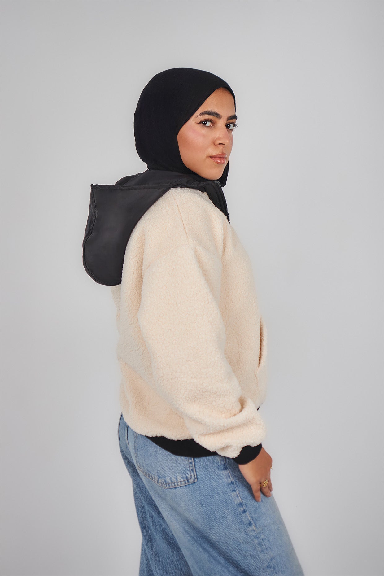 كابيشو من قماش أسود ناعم من الداخل والخارج لتباين لوني مميز وحماية إضافية من البرد.