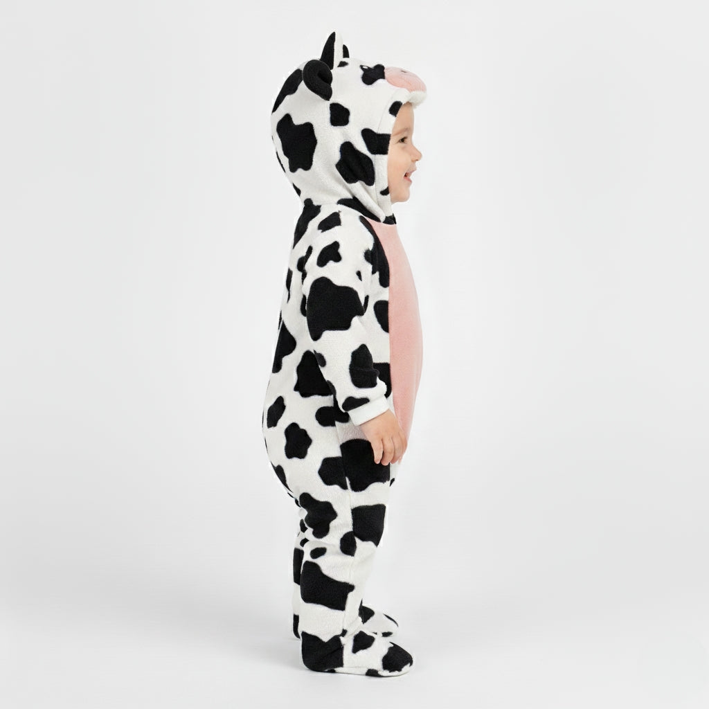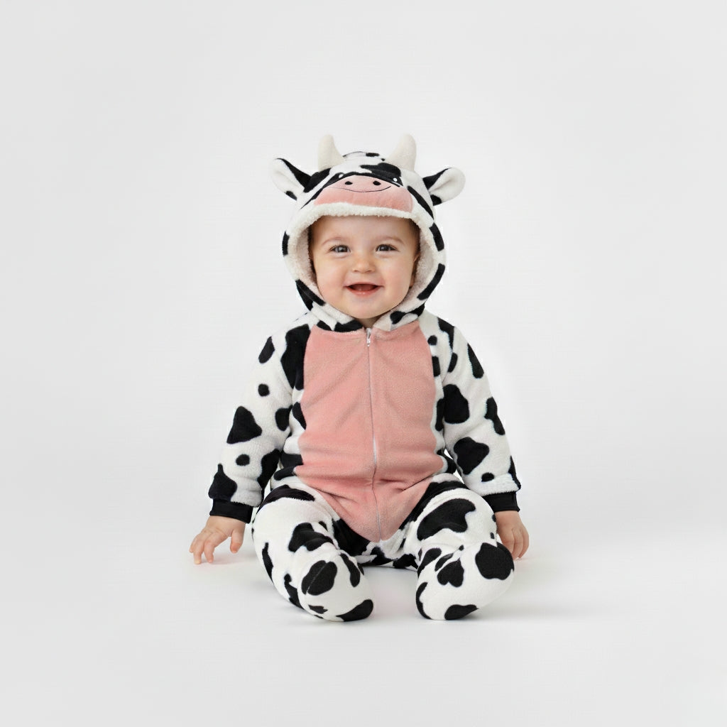 جامبسوت أطفال شتوية بتصميم بقرة، مصنوعة من خامة قطيفة فاخرة ناعمة جدًا على البشرة، تمنح دفء مريح وإحساس ناعم طوال اليوم، تجمع بين الأناقة والمرح، بلون أبيض مزين بنقوش سوداء، مع جزء أمامي باللون الوردي الفاتح يضيف لمسة طفولية جذّابة.