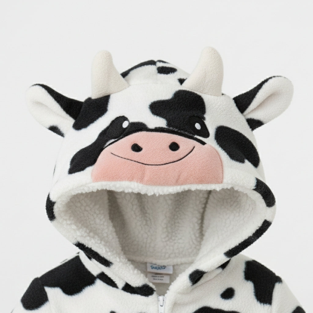 الكابيشو مزوّد بتفاصيل وجه بقرة مطرّزة بعناية، مع قرون وأذنين صغيرتين تضيف مظهر مرح وحقيقي، تُغلق البدلة بسوستة أمامية كاملة من الرقبة حتى القدم لتسهيل اللبس والخلع بسرعة وأمان، خصوصًا للأطفال الرضع.