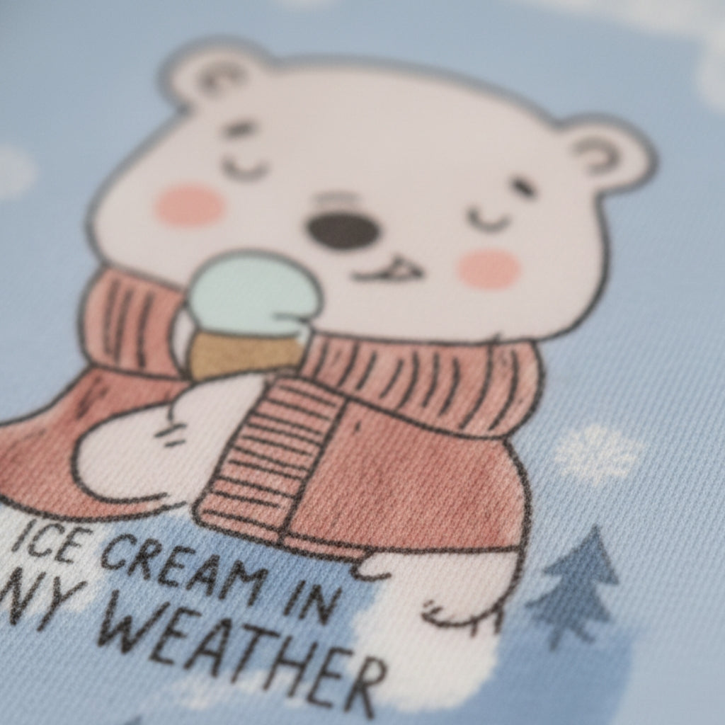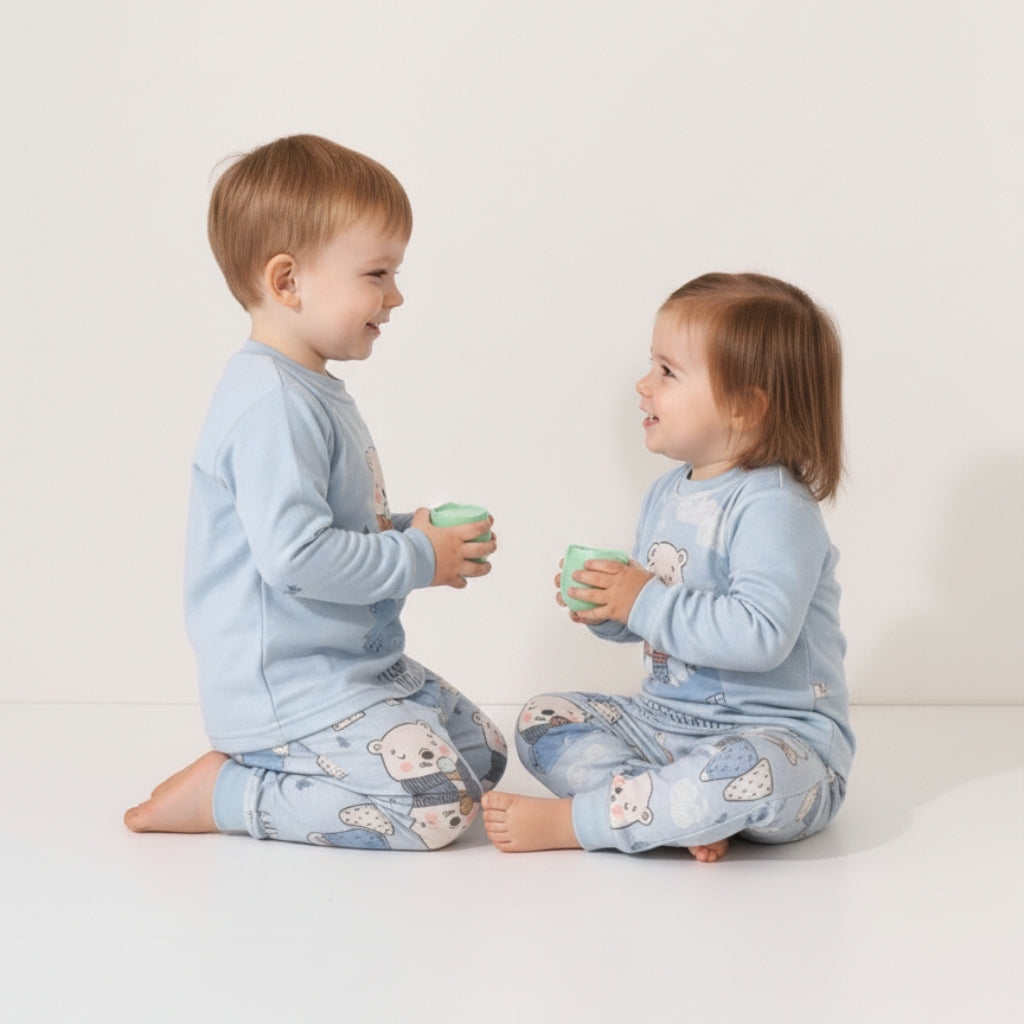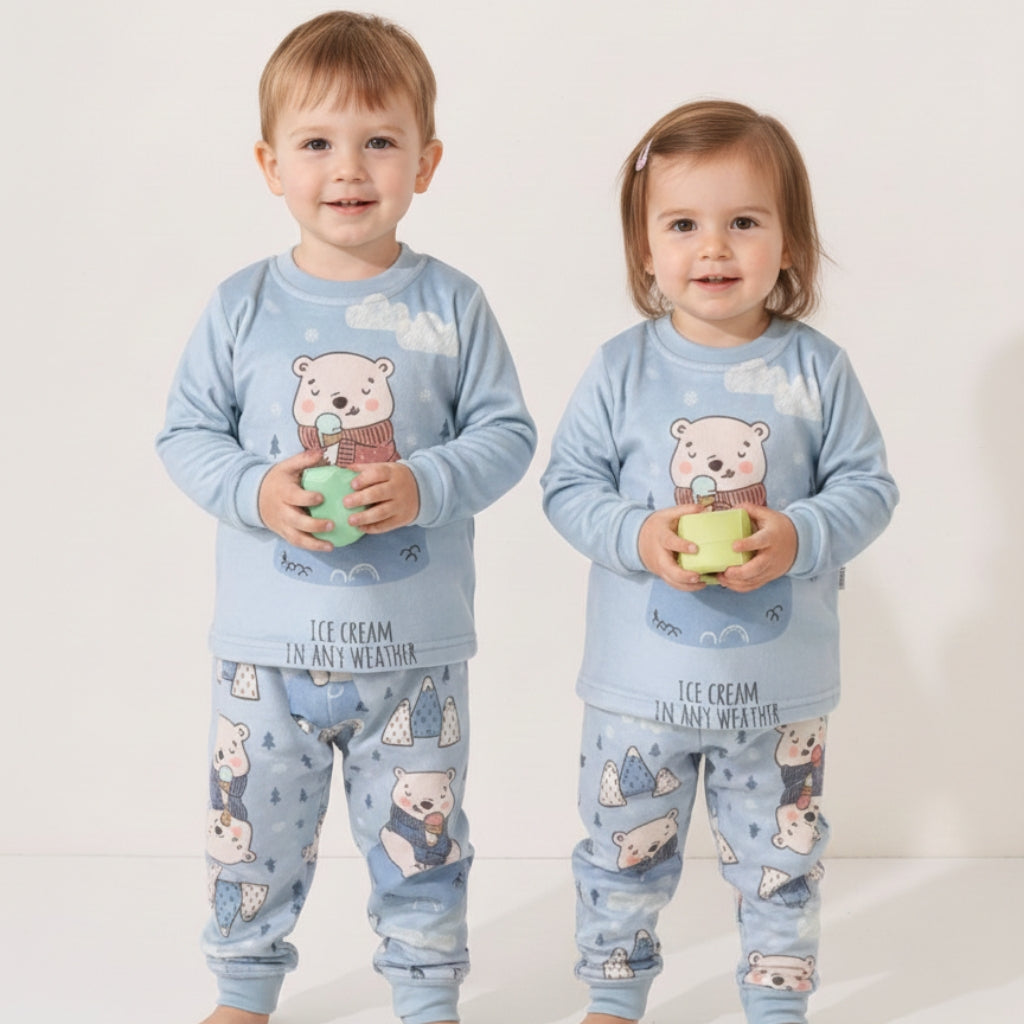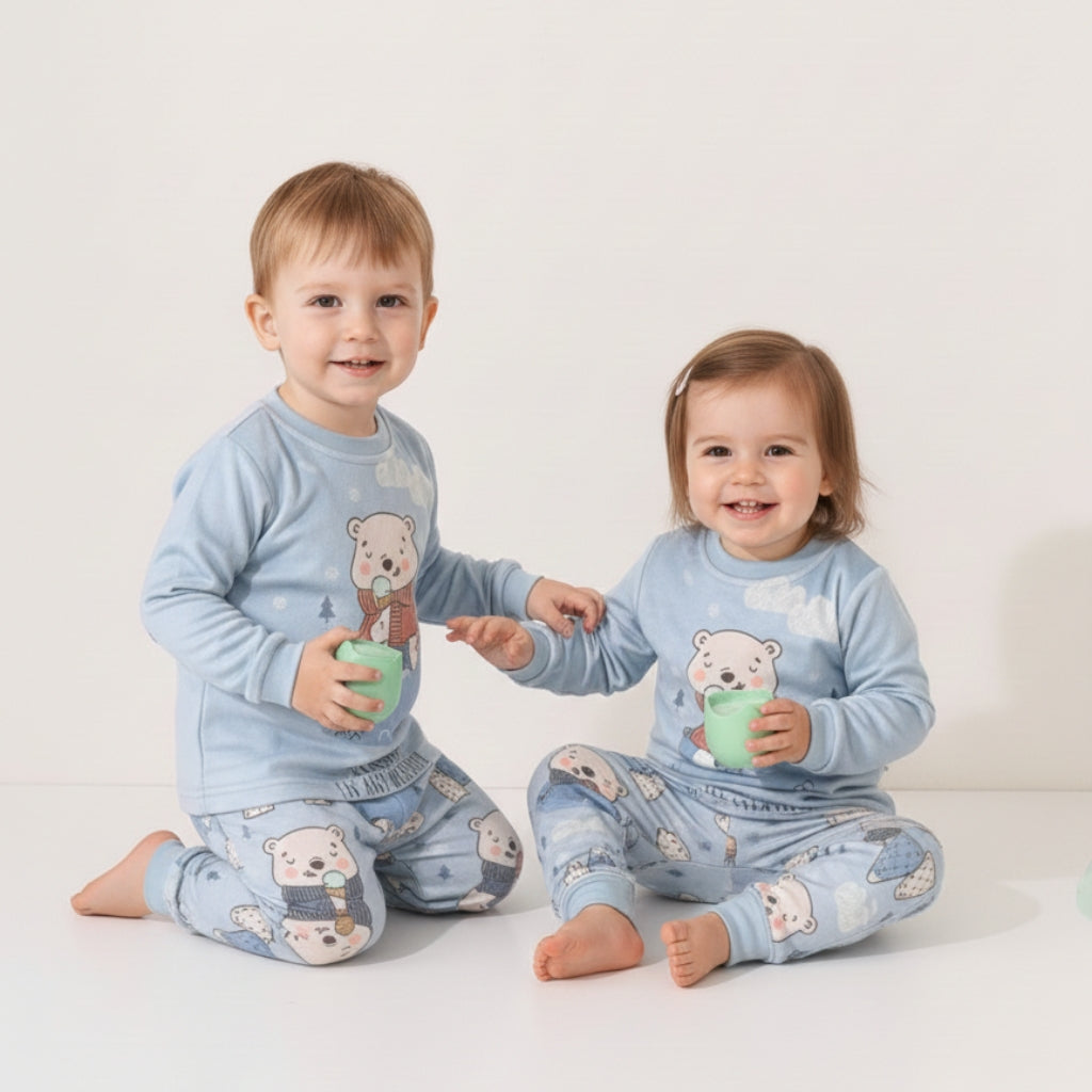 طقم بيجاما أطفال لطيف باللون الأزرق الفاتح، بتصميم دب صغير الخامة قطيفة هايدي ناعم من الداخل والخارج ومريحة مناسبة لبشرة الأطفال، مع بنطال بنفس الطباعة لمظهر متناسق وكيوت. مثالي للنوم والبيت طوال اليوم.