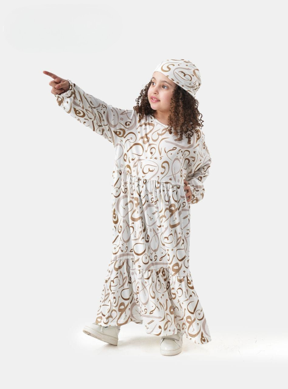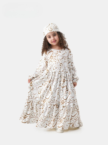 يتميز بتصميم طويل واسع وانسيابي بأكمام طويلة، مع طبعة رقيقة بألوان هادئة تضيف لمسة بناتيّة جميلة. يأتي مع طرحة متطابقة بنفس النقشة لإطلالة متناسقة وأنيقة.