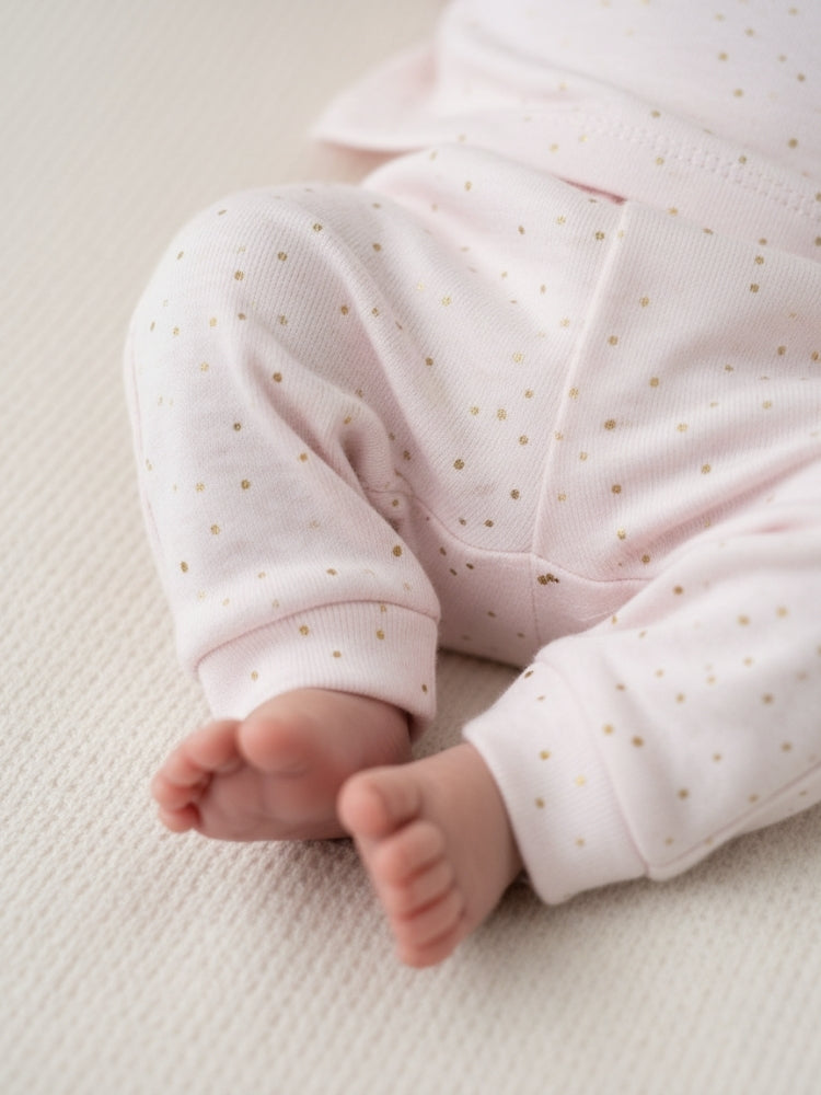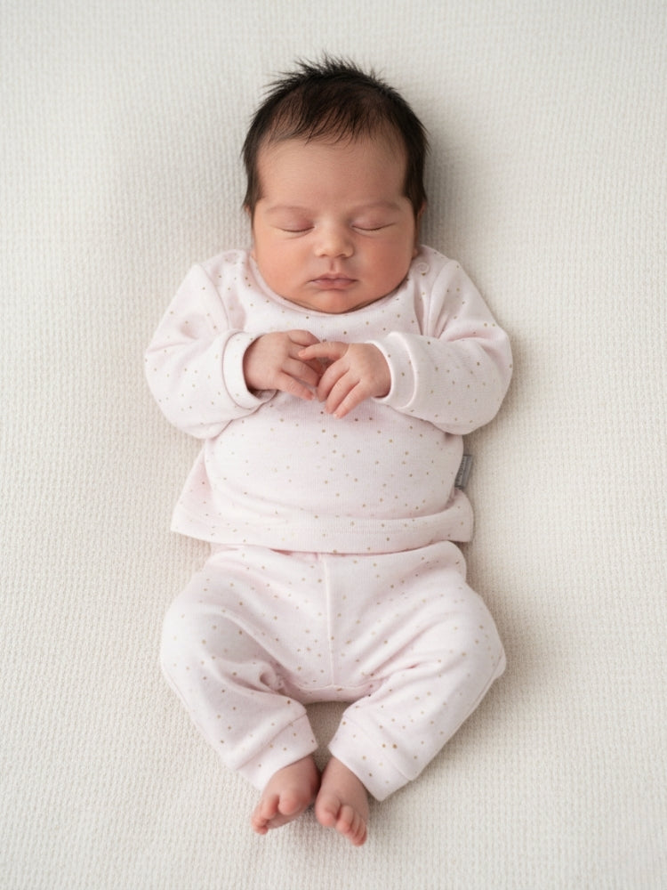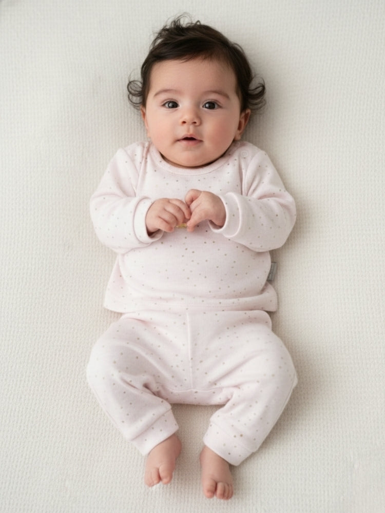 الطقم مكوّن من بلوزة بأكمام طويلة وبنطلون مطابق، مصنوعين من خامة القطن البرسولا الناعمة التي تمنح بشرة البيبي إحساسًا لطيفًا وتهوية ممتازة، ومناسبة تمامًا لحديثي الولادة.